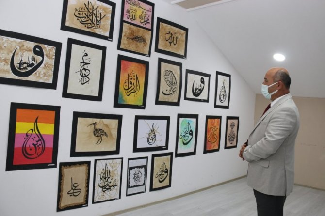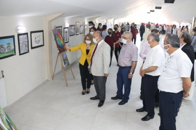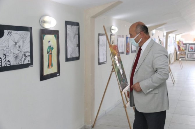 Sergide yer alan resimleri inceleyen İl Milli Eğitim Müdürü Hasan Başyiğit, serginin oluşturulmasında emeği geçenlere teşekkür etti.
