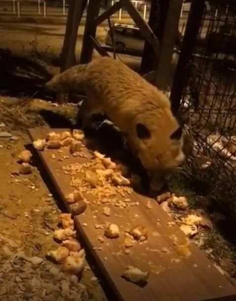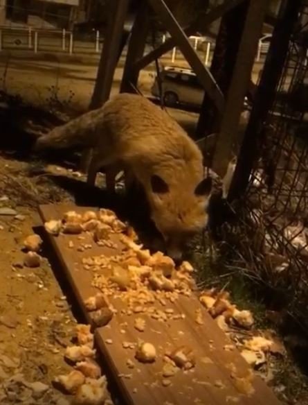 Tilkinin karnını doyurduğu anlar bir vatandaş tarafından cep telefonuyla kayıt altına alındı.