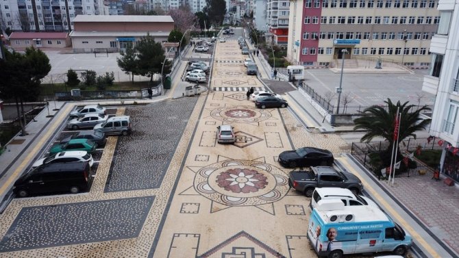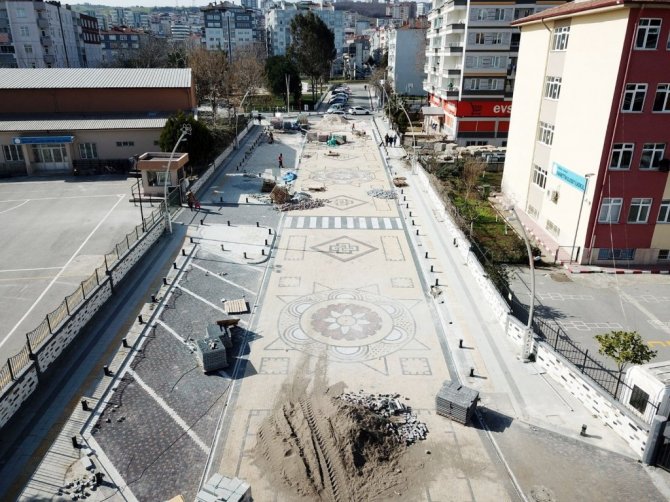 Atakum Belediyesi ekipleri, uzunluğu 300, genişliği ise 10 metre olan Doğuş Caddesi'nde gerçekleştirdiği özverili çalışmalarda 8 santimetre yüksekliğinde doğal rengine sahip begonit taşları kullandı. Samsun'da ilk defa kullanılan ve dört tarafı raylı kilit sistemine sahip taş döşemeyle birlikte kilit sistemi oluşturuyor. Caddenin her iki yanında bulunan okullar düşünüldüğünde uygulanan sistemde taşıt ve yayalar için emniyet faktörü ön planda olurken aynı zamanda yüzde 100 de konfor sağlıyor. Teknik özellikleriyle kullanım kolaylığı sağlanırken, arkeolojik kazılardan çıkan mozaik motiflerden esinlenerek tasarlanan kilim deseniyle de göz dolduruyor.