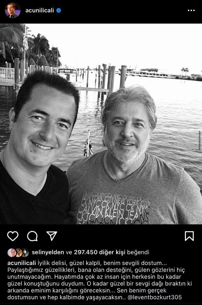 Ünlü televizyoncu Acun Ilıcalı, yakın arkadaşı Levent Bozkurt'un ölüm haberi ile yasa boğuldu. Ilıcalı, sosyal medya hesabından yakın dostu ile çekilmiş bir fotoğrafı duygu dolu sözlerle paylaştı.