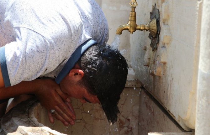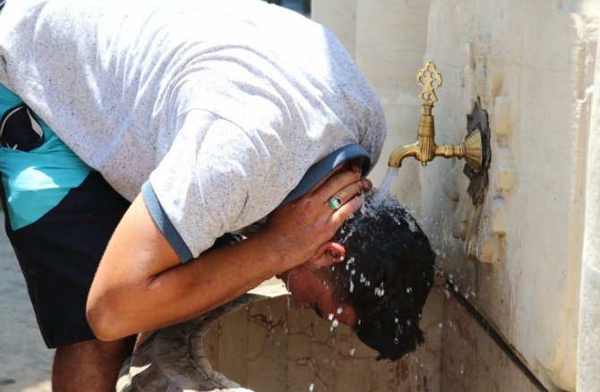 Parklardaki güvercinler ise sıcak havadan bunalıp süs havuzuna girerek serinledi. Güvercinlerin tek tek havuza girip başlarını suya daldırıp çıkardıkları görüldü.