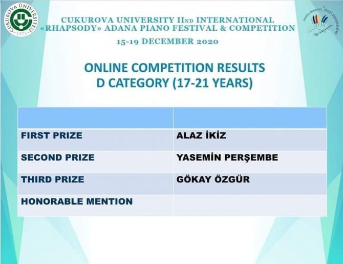 Aydın Adnan Menderes Üniversitesi (ADÜ) Devlet Konservatuarı Öğrencisi Yasemin Perşembe, Çukurova Üniversitesi tarafından 15-19 Aralık 2020 tarihleri arasında 11.'si düzenlenen Uluslararası "Rhapsody" Adana Piyano Yarışmasında ikincilik ödülüne layık görüldü.
