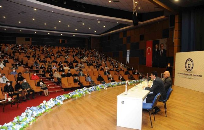 Toplantıya, ADÜ Rektörü Prof. Dr. Osman Selçuk Aldemir'in yanı sıra Aydın Meslek Yüksekokulu Müdürü Prof. Dr. İlyas Karabıyık, öğretim üyeleri ve öğrenciler katıldı. Öğrencilerin ülkemizin geleceği ve teminatı olduğunu vurgulayan ADÜ Rektörü Prof. Dr. Osman Selçuk Aldemir, "Kişiliğinizi, karakterinizi, tarzınızı, tavrınızı tam belirleyeceğiniz noktadasınız. Hayatta başarılı olmak için özgüvenli, donanımlı ve farklılıklarınızı ortaya koyacak şekilde kendinizi yetiştirmelisiniz. Evlatlarım; devlet, bayrak, millet, ezan başlıca şiarınız olsun. Her zaman yanınızda ve destekçiniz olduğumuzu unutmayın" dedi.