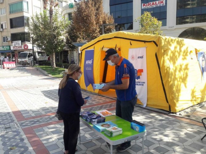 AFAD Aydın İl Müdürlüğü Nazilli'de kurduğu afet eğitim çadırı ve dağıtılan broşürler ile vatandaşları afetlere karşı bilinçlendiriyor.