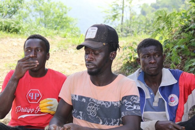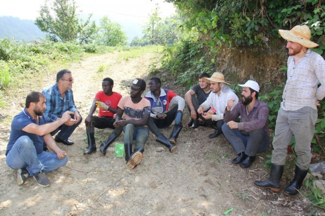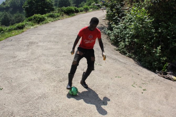 Çay toplamak için Rize'ye gelen Afrikalı çay işçileri, molalarını futbol oynayarak değerlendiriyor.