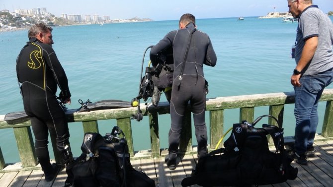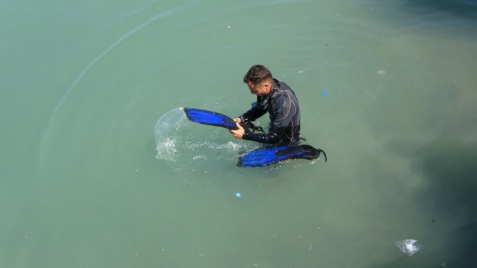 Adana Büyükşehir Belediyesi Çevre Koruma ve Kontrol Daire Başkanlığı Denizcilik Şube Müdürlüğü Dalgıçları Özge Demirkoparan ve Gökhan Bahar, kendilerine teslim edilen yeşil deniz kaplumbağasını takıldıkları ağlardan ve misinalardan kurtardıktan sonra yeniden doğal ortamlarına bıraktı.
