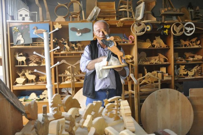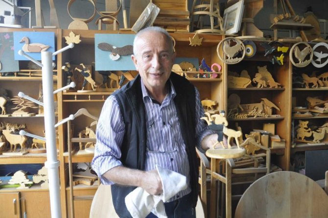 Çocukluğundan beri el sanatlarına hevesi olduğunu anlatan Ayhan Ertan, "Genellikle ağaç biblolar yapıyorum. Camın üzerine de oydum. Ağacın üzerine de oydum. Emekli olunca çokça fırsat bulduk. Okulda da resmim iyiydi zaten benim. Biraz da internetten fikirler aldık. Ortaya bu eserler çıktı" dedi.