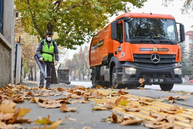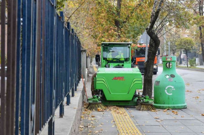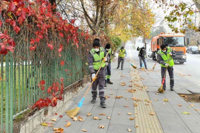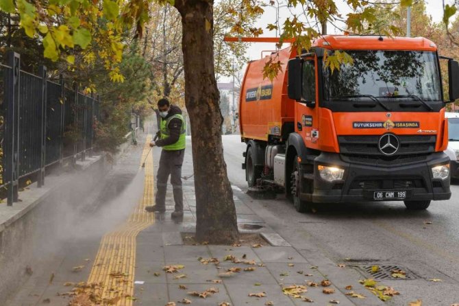 Ankara Büyükşehir Belediyesi Kent Estetiği Daire Başkanlığı ekipleri, cadde ve bulvarlarda ağaçlardan dökülen ağaç yapraklarını temizliyor. Altyapıda aksaklıklara yol açmaması, mazgalları tıkayarak taşkınlara sebebiyet vermemesi ve kaldırımlarda kaygan zemin oluşturmaması için 650 personel, 105 vakumlu yol süpürge aracı, 14 kaldırım üzeri mini temizlik aracı ile 7/24 saat temizlik çalışması gerçekleştiriliyor.