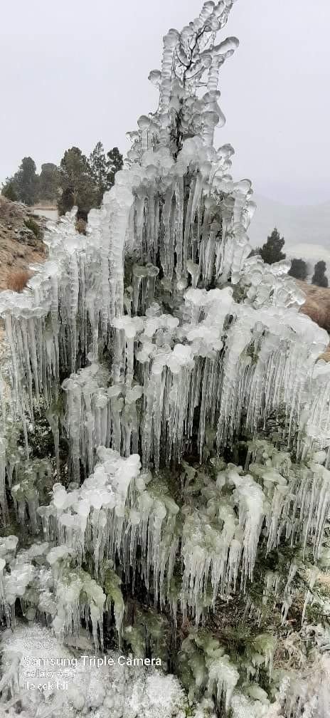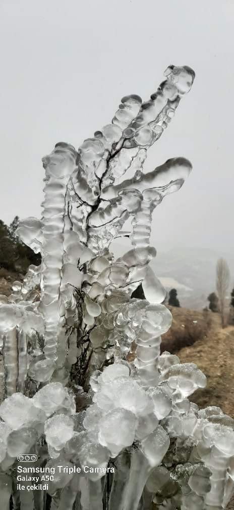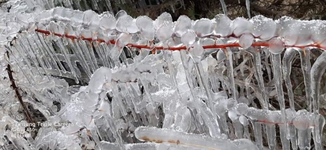 Denizli'nin Çameli ilçesinde hava sıcaklığının eksi 10 dereceyi görmesiyle ağaçlarda buz sarkıtları oluştu. Buz tutan bir yolda ise trafik kazası meydana geldi.