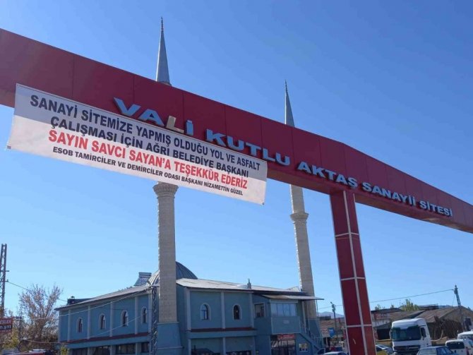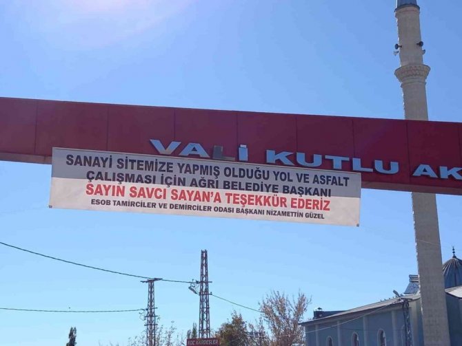 Sanayi Sitesinde sorunlu olan yolların yenilenmesi ve asfaltlanmasının ardından sanayi esnafı, sanayi sitesi girişinde bulunan tabelaya pankart asarak Belediye Başkanı Savcı Sayan'a teşekkür ettiklerini bildirdi. Konuya ilişkin açıklamalarda bulunan ESOB Tamirciler ve Demirciler Odası Başkanı Nizamettin Güzel, "Sanayi Sitemize yapmış olduğu yol ve asfalt çalışması için Ağrı Belediye Başkanı Savcı Sayan'a teşekkür ederiz." dedi.