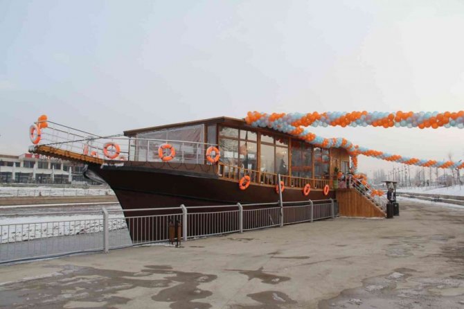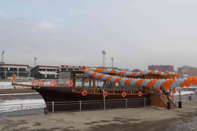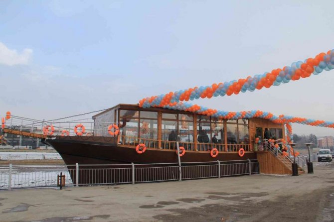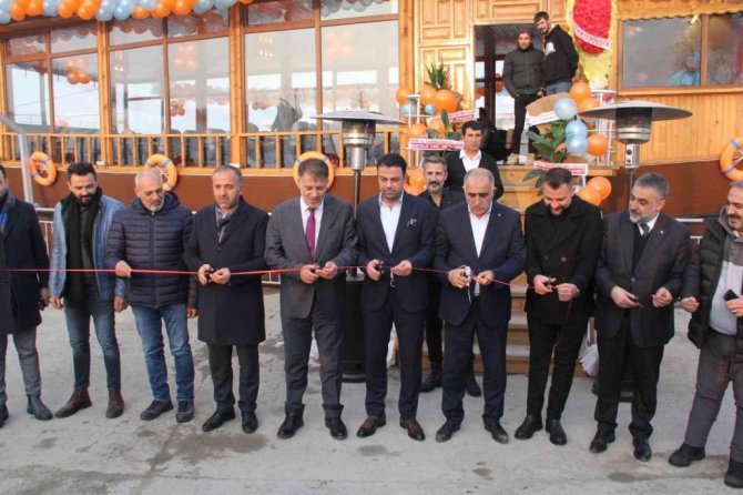 Denizi olmayan Ağrı'da, 7 metre genişlik 21 metre uzunluğa sahip dev balıkçı teknesinden yapılan kafe ve restorantın açılışı yapıldı.