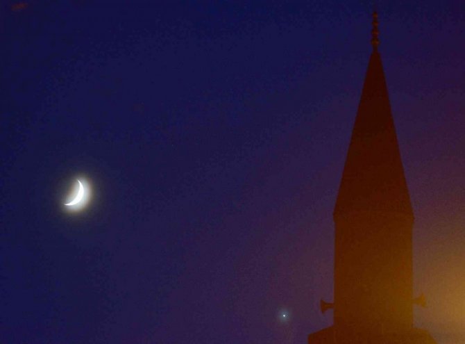 Ahlat ilçesinde akşam hilal şeklindeki Ay görenleri görenleri kendine hayran bıraktı. Gökyüzünde belirgin bir şekilde görülebilen hilalin cami minareleriyle oluşturduğu görüntüler hayranlık uyandırırken, fotoğraf tutkunları oluşan görüntüleri objektiflerine yansıtarak arşivlerine kattı.