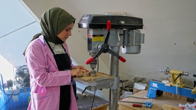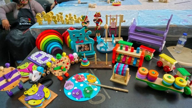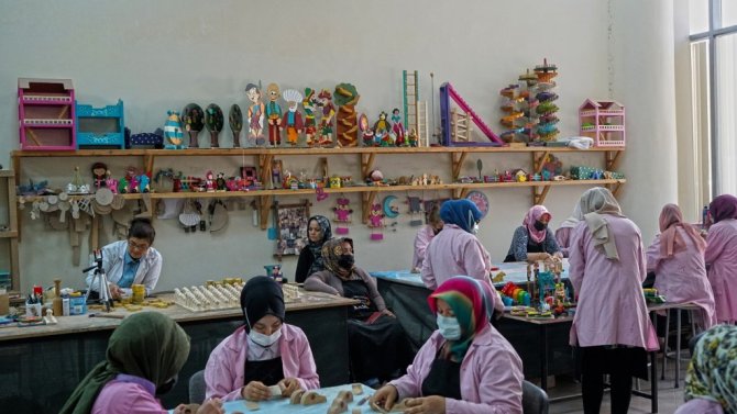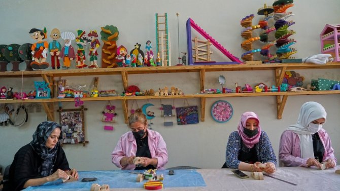 Kahramanmaraş ahşap oyuncak atölyesinde eğitim gören 25 kursiyer hem meslek öğreniyor hem de birbirinden farklı oyuncaklar tasarlayıp satarak ev ekonomilerine katkı sağlıyor.