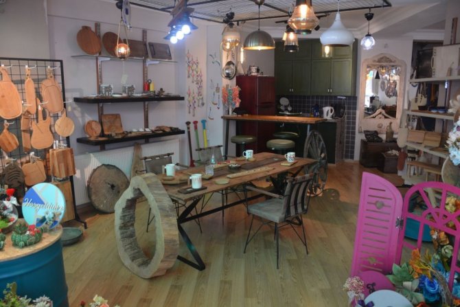 Bu atölyede eski evden kalma bir kapıyı, dost sohbetlerine şahitlik etmiş bir masayı, köklerinden kopup yeni yaşamlara yuva olmaz diye bir kenara atılmış bir kütüğü, bir dal parçasını sıcacık anılara ortak olacak yepyeni dekoratif ürünler haline getiriyor.