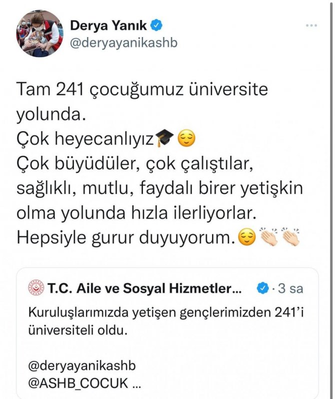 Aile ve Sosyal Hizmetler Bakanı Derya Yanık, Bakanlığının kuruluşlarında yetişen gençlerden bu yıl sınava giren 241'inin üniversiteye yerleştiğini...