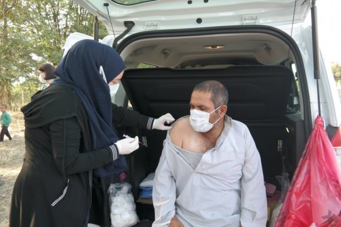 Şanlıurfa'dan çalışmak için Eskişehir'e gelen mevsimlik tarım işçileri çadır kurdukları bölgede korona virüs (Covit-19) aşılarını yaptırdı.