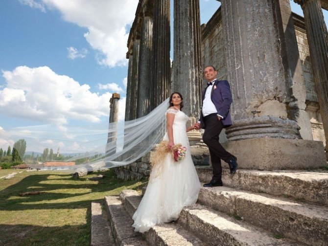 Düğün töreni için gelinlik ve damatlıklarını giyen çiftler, kuaför ve makyaj işlemi sonrası soluğu Aizonai Antik Kentinde alıyor. Binlerce yıllık sütunların, Antik Tiyatro’nun ve Zeus Tapınağı’nın önünde ve içinde romantik pozlarını veren çiftler, renkli bir düğün albümüne kavuşuyor.
