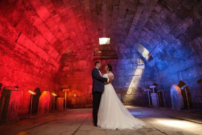 Son dönemde gelin ve damat adayları, fotoğraf çektirmek için Kütahya’nın Çavdarhisar ilçesinde bulunan Aizonai Antik Kenti’ne akın ediyor.