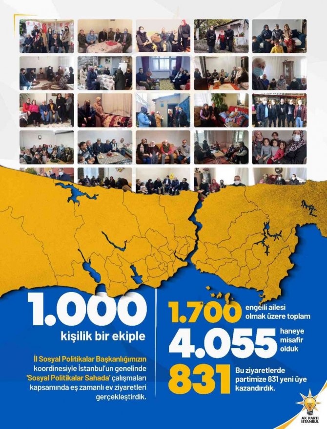 AK Parti İstanbul İl Sosyal Politikalar Başkanlığı, Şehit yakınları, gazi, hasta, yaşlı ve engelli vatandaşlar başta olmak üzere yaklaşık bin kişilik ekiple 1 günde toplam 4 bin 55 ev ziyaret etti.