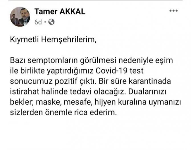 AK Parti Manisa Milletvekili Tamer Akkal, bugün sosyal medya hesabı üzerinden bir paylaşım yaparak eşi ve kendisinin bazı semptomlar göstermeleri üzerine yaptırdıkları Covid-19 testinin sonucunun pozitif çıktığını açıkladı. Akkal, sosyal medya hesabı üzerinden yaptığı açıklamada, "Kıymetli hemşehrilerim, bazı semptomların görülmesi nedeniyle eşim ile birlikte yaptırdığımız Covid-19 test sonucumuz pozitif çıktı. Bir süre karantinada istirahat halinde tedavi olacağız. Dualarınızı bekler; maske, mesafe, hijyen kuralına uymanızı sizlerden önemle rica ederim."