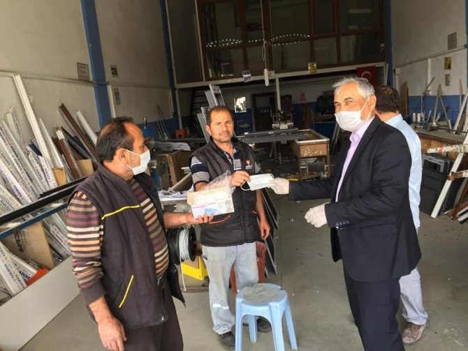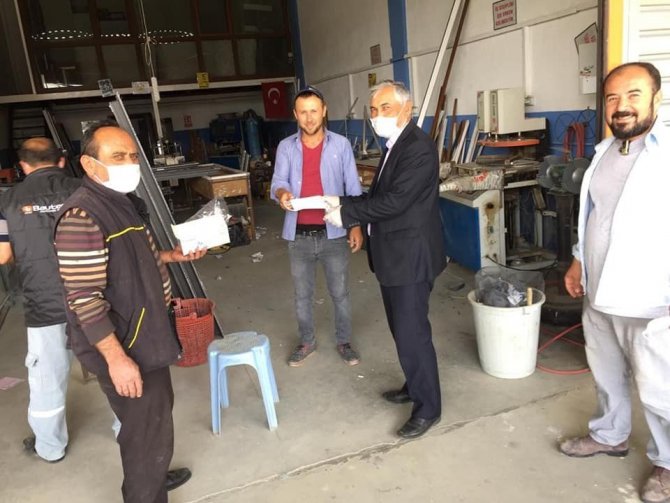 AK Parti Sarıgöl İlçe Başkanı Erdoğan Büyükdinç ve yönetim kurulu üyeleri korona virüse karşı sanayi esnafını ziyaret ederek maske dağıttı.