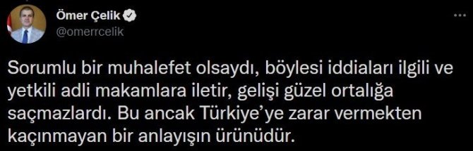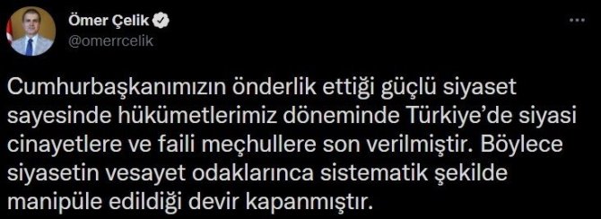 AK Parti Genel Başkan Yardımcısı ve Parti Sözcüsü Ömer Çelik, resmi sosyal medya hesabından, son zamanda tartışmalara yol açan siyasi cinayet konusuna ilişkin bir dizi paylaşım yaptı. Çelik, Cumhurbaşkanı Recep Tayyip Erdoğan'ın önderlik ettiği güçlü siyaset sayesinde hükumetleri döneminde Türkiye'de siyasi cinayetlere ve faili meçhullere son verildiğini belirterek, "Böylece siyasetin vesayet odaklarınca sistematik şekilde manipüle edildiği devir kapanmıştır" ifadesine yer verdi.