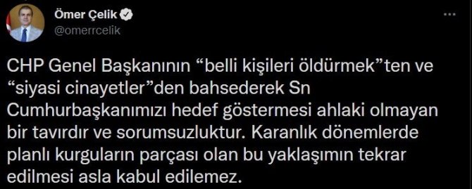 Sözcü Çelik, Cumhuriyet Halk Partisi (CHP) Genel Başkanı Kemal Kılıçdaroğlu'nun "belli kişileri öldürmek"ten ve "siyasi cinayetlerden"den bahsederek Cumhurbaşkanı Erdoğan'ı hedef göstermesinin ahlaki olmayan bir tavır ve sorumsuzluk olduğunu aktararak, "Karanlık dönemlerde planlı kurguların parçası olan bu yaklaşımın tekrar edilmesi asla kabul edilemez" dedi.