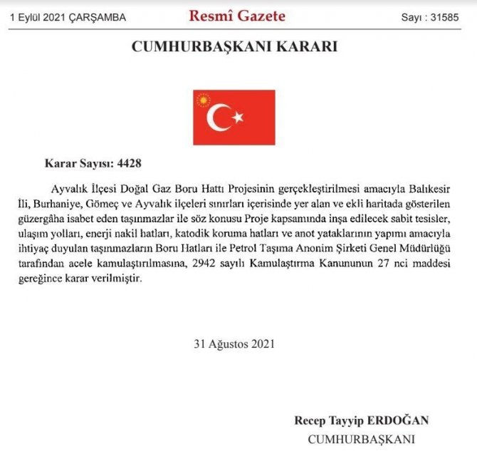 1 Eylül 2021 tarihli resmî gazetede konuyla alakalı Cumhurbaşkanı Kararı yayınlandığını söyleyen Milletvekili Canbey, "Her adımını sabırla ve istikrarla takip ettiğimiz Ayvalık ve Gömeç ilçelerimize doğalgaz gelmesi konusunda, Cumhurbaşkanımız Sayın Recep Tayyip Erdoğan mutlu haberi verdi. Doğalgaz boru hattının gerçekleşmesi amacıyla Burhaniye'den başlayıp, Gömeç ve Ayvalık'a devam eden güzergaha isabet eden taşınmazlar ile söz konusu proje kapsamında inşa edilecek sabit tesisler, ulaşım yolları, enerji nakil hatları, katodik koruma hatları ve anot yataklarının yapımı amacıyla ihtiyaç duyulan taşınmazların acele kamulaştırılması kararı resmi gazetede yayınlandı. Ayvalık ve Gömeç ilçelerimizi doğalgaza kavuşturmamıza çok az kaldı." ifadelerini kullandı.