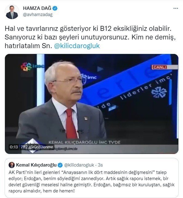 Cumhurbaşkanı Recep Tayyip Erdoğan, partisinin grup toplantısında yaptığı konuşmada yeni anayasa tartışmalarına ilişkin, "Biz yeni anayasa diyoruz, birileri de çıkıyor "Gerekirse ilk 4 maddeyi de değiştiririz" diyerek hemen PKK güdümündeki siyasi yapıya göz kırpmaya çalışıyor" ifadelerini kullanmıştı. CHP Genel Başkanı Kemal Kılıçdaroğlu, Cumhurbaşkanı Erdoğan'a sosyal medya hesabından tepki gösterdi. AK Parti Genel Başkan Yardımcısı Hamza Dağ, Kılıçdaroğlu'nun sosyal medya paylaşımına bir video ile cevap verdi. Kılıçdaroğlu'nun daha önce yaptığı açıklamaları içeren görüntüleri paylaşan Dağ, "Hal ve tavırlarınız gösteriyor ki B12 eksikliğiniz olabilir. Sanıyoruz ki bazı şeyleri unutuyorsunuz. Kim ne demiş hatırlatalım Sayın Kılıçdaroğlu" dedi.
