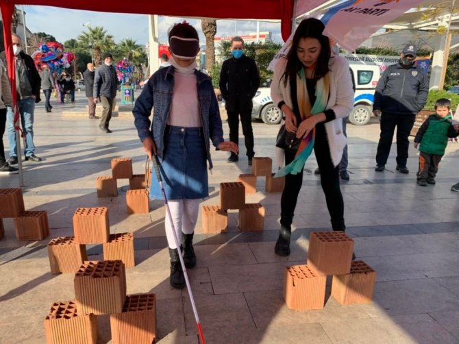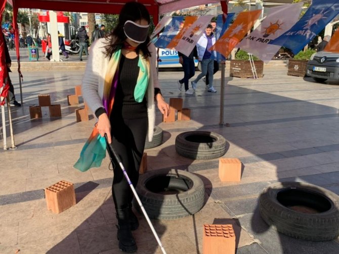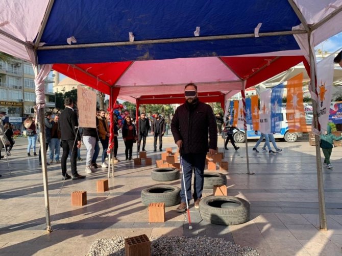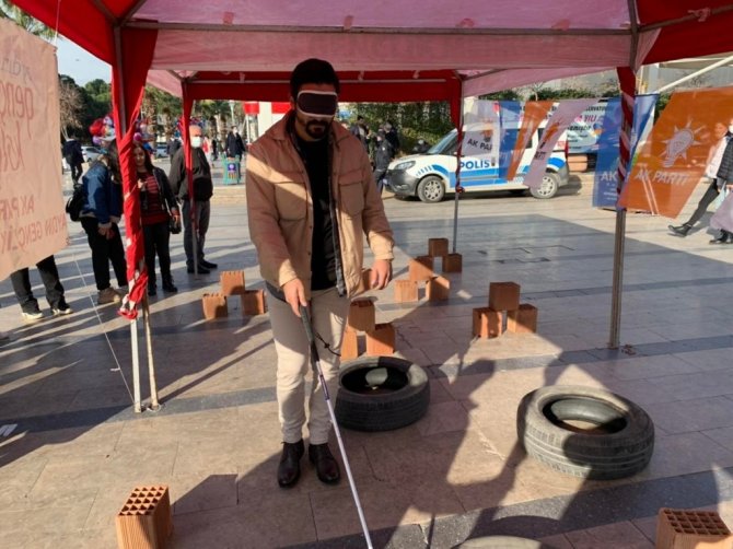 Aydın'da görme engellilerin sıkıntılarına dikkat çekmek isteyen AK Partili gençler, gözlerini kapatarak ellerine aldıkları beyaz baston ile empati parkurunu tamamlamaya çalıştı.