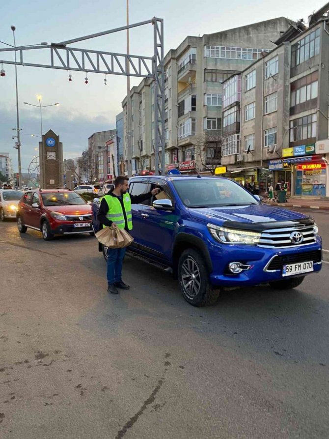 Tekirdağ'ın Muratlı ilçesinde AK Parti Gençlik Kolları yöneticileri, iftara yetişmeye çalışan vatandaşlara hazırladıkları iftariyelikleri ikram etti.