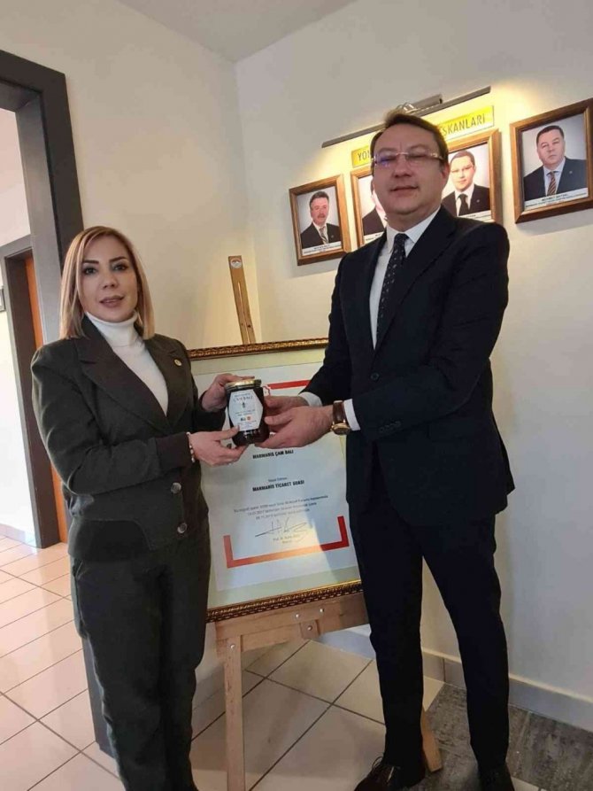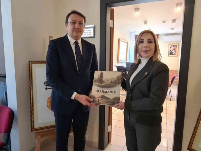 AK Parti Milletvekili Yelda Erol Gökcan'a üzerinde adı yazan Marmaris Çam Balı ve Ticaret Odası desteği ile çıkarılan Marmaris kitabı hediye edildi.