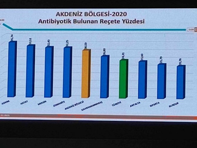 AİK Daire Başkanı Mesil Aksoy, Akdeniz Bölgesi'nde antibiyotik reçetelendirme açısından en başarılı ilin Burdur olduğunu belirterek, akılcı ilaç kullanımı konusundaki çalışmaları nedeniyle Burdur İl Sağlık Müdürlüğünü örnek gösterdi. AİK'in verilerine göre antibiyotik bulunan reçete yüzdesi Türkiye genelinde yüzde 24,11 olarak