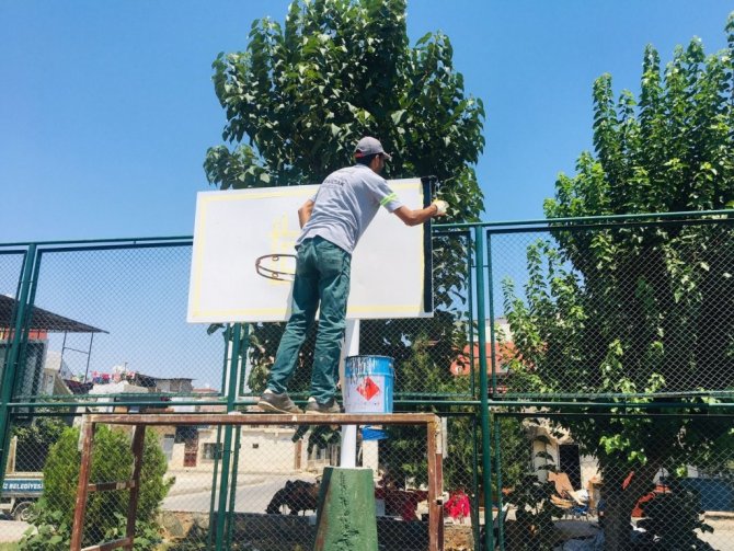 Bekirde Kültür Sanat Evinin önünü, çocuk oyunları için rengarenk boyayan ekipler, Akyüz Parkında bulunan potaları da bakımdan geçirip boyadı; Yaşar Kemal Parkının bordür taşlarını boyayıp yeniledi.