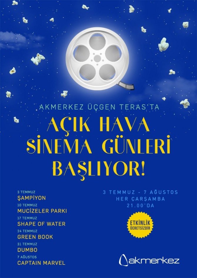 Bir yaz klasiği haline gelen Akmerkez açık havada sinema keyfi, bu yıl da tüm eğlencesi ile 3 Temmuz Çarşamba günü başlayacağı duyuruldu. 7 Ağustos tarihine kadar her Çarşamba günü gerçekleşecek olan gösterimler; yönetmenliğini Ahmet Katıksız’ın yaptığı, ‘Şampiyon’ filmi ile başlayacak. Film, 1994-1997 yıllarında Jokey Halis Karataş, Begüm Atman ve şampiyon at Bold Pilot‘ın yaşamını ve halka umut oluşunu beyaz perdeye aktarıyor.