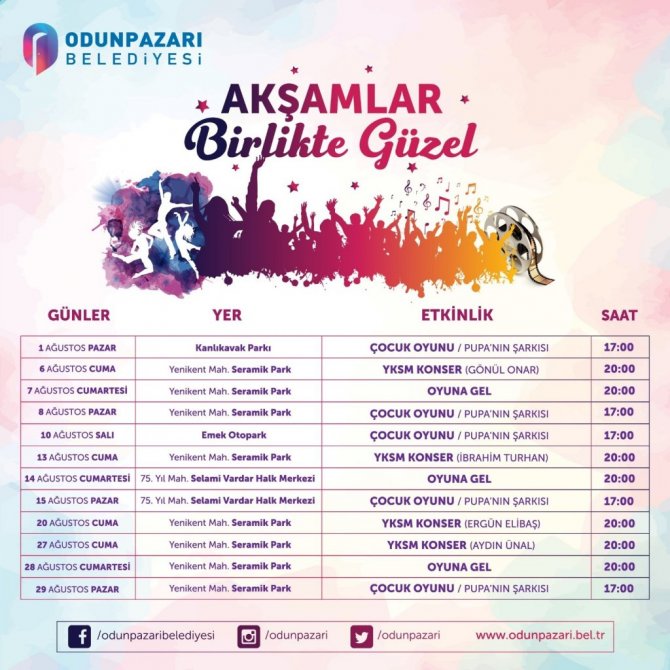 Gönül Onar, İbrahim Turhan, Ergün Elibaş ve Aydın Ünal birbirinden güzel konserlere imza atacak. Sosyal mesafe, maske ve hijyen kurallarına uygun olarak gerçekleşecek etkinlikler, ücretsiz olacak. "Akşamlar Birlikte Güzel" etkinlikleri Ağustos ayı programı, 1 Ağustos Pazar Günü saat 17.00'de Kanlıkavak Parkı'nda Pupa'nın Şarkısı adlı çocuk oyunu ile başlayacak. 6 Ağustos Cuma günü saat 20.00'de Gönül Onar, Yenikent Mahallesi'nde bulunan Seramik Park'ta birbirinden güzel şarkı ve ezgileri Odunpazarlılar için seslendirecek. 7 Ağustos Cumartesi Günü ise saat 20.00'de Odunpazarı Belediye Tiyatrosu oyuncuları Yenikent Mahallesi'nde bulunan Seramik Park'ta "Oyuna Gel" adlı yetişkin oyunu ile tiyatro severlerle buluşacak.