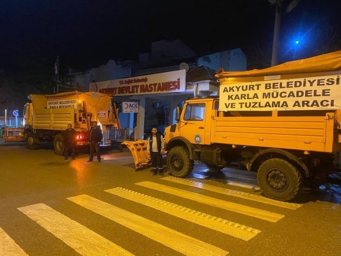 Akyurt Belediyesi personeli, gece saatlerinde beklenen kar yağışı öncesinde nöbet tuttu. Kar yağışının başlaması ile ekipler yolları açık tutmak için çalışmalarını aralıksız sürdürdü.