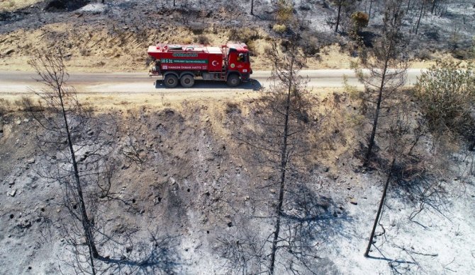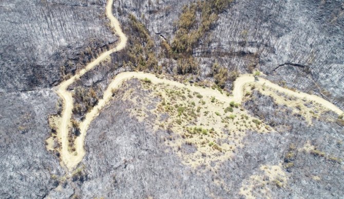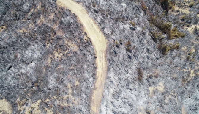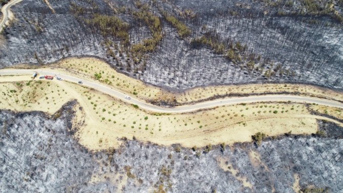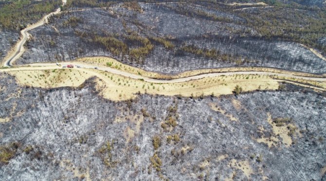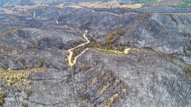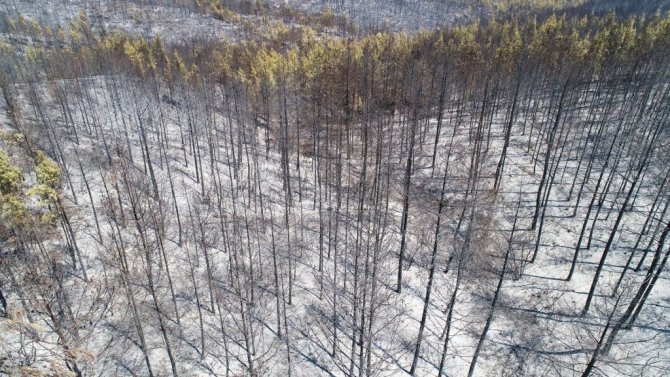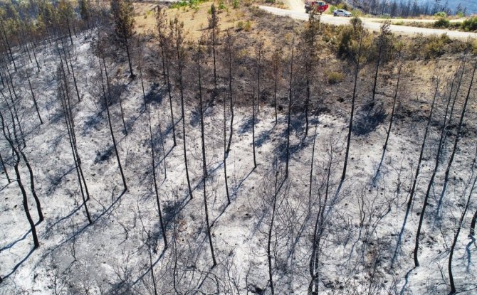 Çok büyük bir alanı kaplayan yangının ardından ormanlık alan İhlas Haber Ajansı tarafından drone ile görüntülendi. Yanan ağaçlardan geriye sadece küllerin kaldığı, birçok alanın yangından etkilendiği görüldü.