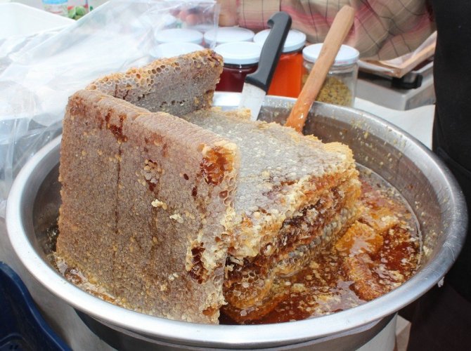 Yaklaşık 35 yıldır bal üretimi yapan Ahmet Kirazcı, standında arı sütü, propolis, polen gibi arı ürünlerini de satıyor.