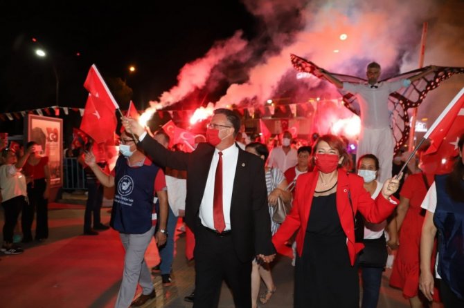 Cumhuriyet ve Demokrasi Meydanı'nda yapılan kutlamalar saygı duruşunda bulunulmasının ardından hep bir ağızdan İstiklal Marşı'nın okunmasıyla başladı. Kemaliye Seymen ve Zeybek Ekibi gösterilerinden sonra eşi Selen Öküzcüoğlu ile sahneye çıkan Belediye Başkanı Ahmet Öküzcüoğlu, "Pandemi ile mücadele ediyoruz. Morale ihtiyacımız vardı. Geçen sene 30 Ağustos'u evlerimizden kutlamak zorunda kalmıştık. Şimdi beraber kutlamanın sevincini ve onurunu hep beraber yaşıyoruz. Bu zafer Türk'ün diriliş destanıdır. Atamız hattı müdafaa yoktur, sathı müdafaa vardır. O satıh ta tüm vatandı. İşte o vatanda sizin için yatanların torunları burada. Kadınlarımız kağnılarıyla mermi ve erzak taşıdılar. Daha 15'ini doldurmamış çocuklar düşmanların üzerine koştular. O al bayrak bayrağımızı, sancağımız yere düşürmemek için ordumuz var gücüyle çalıştı. 1922'de kazanılan bu savaşta tüm dünya Anadolu'nun Türk yurdu olduğunu öğrendi ve tescillendi. Millet egemenliğine dayanan Türkiye Cumhuriyetinin bağımsızlık ve laikliğe dayanan Türkiye Cumhuriyetinin de temelini attı. Ben bu savaşta başta Ulu Önderimiz Gazi Mustafa Kemal Atatürk olmak üzere tüm silah arkadaşlarını, şehitlerimizi ve gazilerimizi saygı ile minnetle ve şükranla yad ediyorum. Hepinizin bayramı kutlu olsun" dedi.