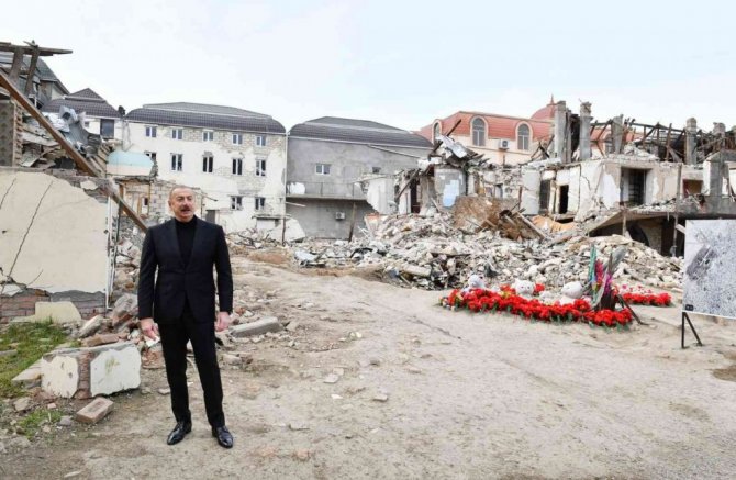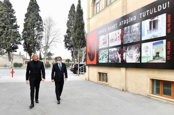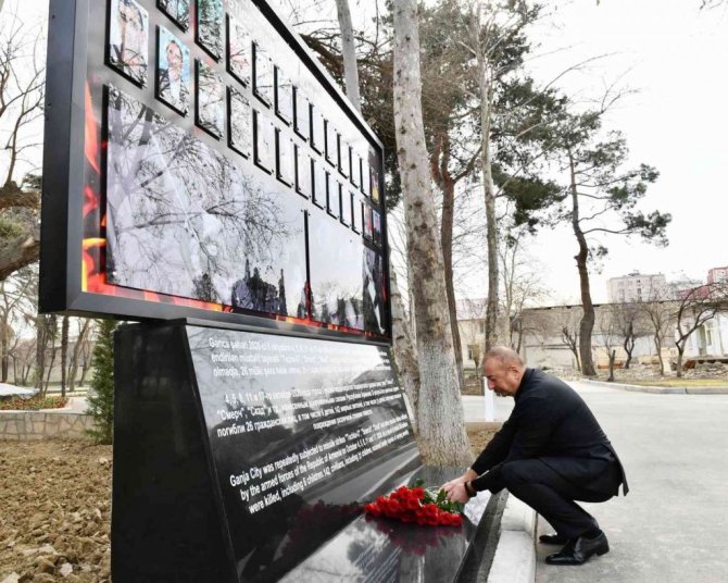 Azerbaycan Cumhurbaşkanı İlham Aliyev, 2. Karabağ Savaşı'nda Ermenistan Silahlı Kuvvetleri'nin füzeli saldırısına uğrayan Gence'de füzenin düştüğü yere inşa edilecek Gence Anıt Kompleksi'nin temelini attı. Temel atma töreninden sonra açıklamalarda bulunan Aliyev, İkinci Karabağ Savaşı sırasında Ermenistan ordusu tarafından Gence'nin defalarca bombalandığını belirterek, "Biliyorsunuz bu yıkılan evlerin önünde olmak, bu korkunç manzarayı izlemek her Azerbaycanlı için çok zor. Şehre 13 roket atıldı, bunlardan 8'i patladı ve 5 kişi öldü, 5'i ise patlamadı. Bu da Ermeni ordusunun durumunu gösteriyor. Ancak bu korkakça saldırı sonucunda vatandaşlarımız hayatta kalmalıydı. Aralarında çocuk, kadın ve yaşlıların da bulunduğu 6 çocuk hayatını kaybetti. Sadece Gence şehrinde, Ermeni faşizminin kurbanları olan 26 sivil korkakça öldürüldü. Gence şehri hem "Tochka-U" hem de "SCUD" füzeleriyle bombalandı. Biz bu konuda sözümüzü söylediğimizde Ermeni tarafı yalanladı. Ardından başka bir yalan uyduran sahte Ermeni propagandası, Azerbaycan'ın kendi şehirlerine ateş açtığını ilan etti. Ne kadar aşağılık ve sahtekâr olduklarını görün" dedi.