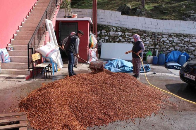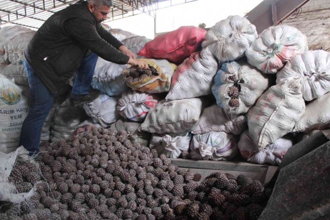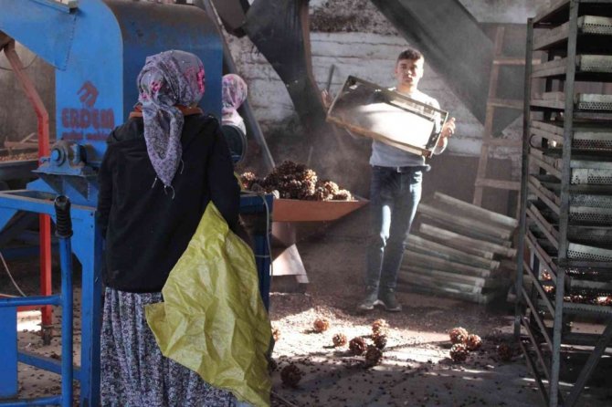 Fabrikaya getirilen kozalakların işleme sürecinden de bahseden Demir, "Kozalakları önce sıcak suda haşlıyoruz. Sonra patozda dövüyoruz. Dövüldükten sonra ortaya çıkan çekirdekleri fırına veriyoruz. Çekirdek kuruduktan sonra kırılıyor içeride, kırıldıktan sonra da seçim odamızda ayıklanıp seçiliyor ve paketleniyor" diye konuştu.