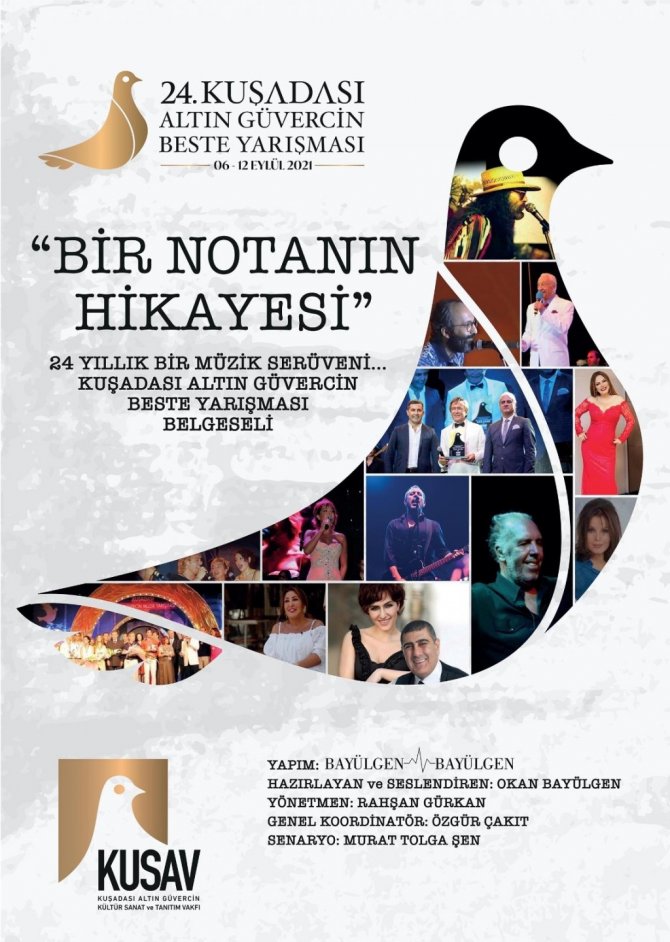 Aydın Büyükşehir Belediyesi, Kuşadası Belediyesi ve Kuşadası Altın Güvercin Kültür Sanat ve Tanıtım Vakfı (KUSAV) tarafından düzenlenen 24. Kuşadası Altın Güvercin Beste Yarışması, bir ilke ev sahipliği yaptı. Ünlü televizyoncu Okan Bayülgen ve ekibi tarafından "24 Yıllık Bir Müzik Serüveni. Kuşadası Altın Güvercin Beste Yarışması Belgeseli" başlığıyla hazırlanan "Bir Notanın Hikâyesi" adlı belgeselin prömiyeri Tarihi Kervansaray'da gerçekleşti. Okan Bayülgen tarafından hazırlanan ve seslendirilen, yönetmenliğini Rahşan Gürkan'ın, genel koordinatörlüğünü Özgür Çakıt'ın, senaristliğini ise Murat Tolga Şen'in yaptığı belgeselin prömiyerine CHP Tokat Milletvekili Kadim Durmaz, Kuşadası Belediye Başkanı Ömer Günel, Belediye Başkan Yardımcıları Oğuzhan Turan, Seyfi Seyhan Suvari, Yusuf Atak, KUSAV Başkanı Levent Köylü, Altın Güvercin Koordinatörü Ali Rıza Türker, Adalet Birlik Partisi Genel Başkanı İrfan Uzun, Karkamış Belediye Başkanı Ali Doğan ile çok sayıda davetli katıldı.