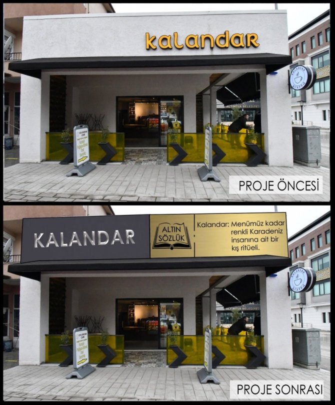 Tabiî ve tarihî değerleri ile dikkat çeken Yalova Altınova Belediyesi, ilçenin özellikle turizme yönelik marka kimliğine büyük katkı koyacak özel bir çalışmaya imza atmaya hazırlanıyor. Estetik, tek tip ve üzerinde "Altın Sözlük" barındıran özel tabela projesi hayata geçtiğinde adından çokça söz ettirecek Altınova'ya mahsus bir çalışma olacak. Görüntü kirliğine son vermek, ana arterlerin estetik görünüme kavuşması ve daha da önemlisi yabancı isimler yerine Türkçe'nin kullanılması için harekete geçen Altınova Belediyesi, çok özel ve örnek bir proje hazırladı. Özellikle ana arter ve caddelere cephesi bulunan tüm işyerlerinin kirliliğe sebebiyet veren tabelalarının sağlıklaştırılması hedefleniyor. Şehir girişleri, ana arterler ve caddelerin şehirlerin vitrini olduğunu ifade eden Altınova Belediye Başkanı Dr. Metin Oral, yeni projenin ilk kez uygulanacağına dikkat çekerek, "Doğa, tarih ve kültürel değerlerimize yakışacak. Mark şehir hamlemize önemli katkı koyacak" şeklinde konuştu.
