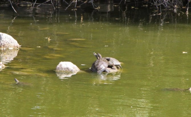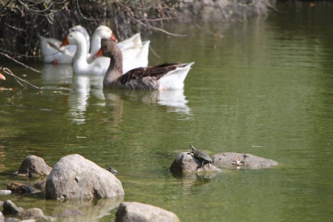 Sulak alanı temizlemesi ve birçok zararlı canlıyı yemesiyle bilinen ender türdeki sevimli kaplumbağaların yaşadıkları gölette izleme ve takip çalışmaları sürüyor.