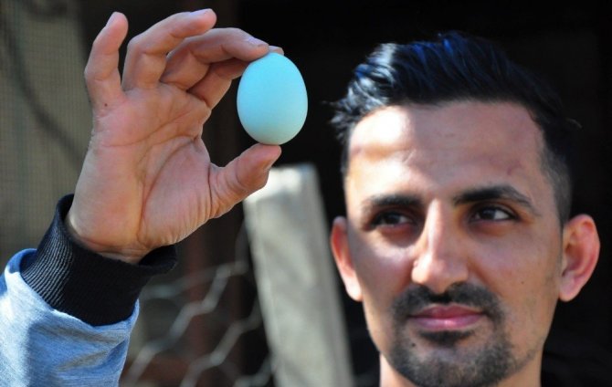 Manisa'da, evinin bahçesinde mavi yumurta yumurtlayan Amerikan ırkı Araucanas tavuklarından yetiştiren İsa Deveci (30), tanesini 50 liradan sattığı yumurtalar...