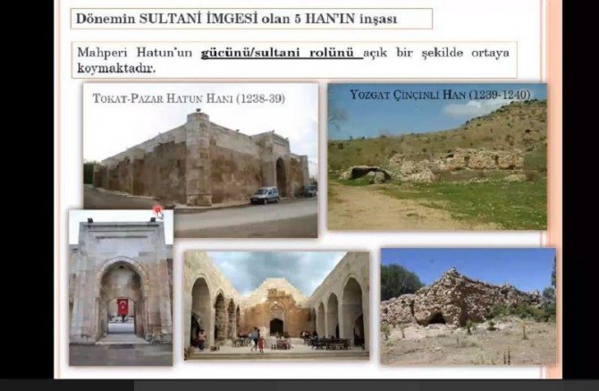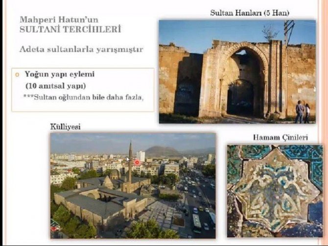 MCBÜ Fen Edebiyat Fakültesi Arkeoloji Bölümü Dr. Öğr. Üyesi Gözde Şakar'ın moderatörlüğünü yaptığı konferansta, Anadolu Selçuklu Devleti hanedan kadınları ve mimari konusunda detaylı bilgiler aktaran Doç. Dr. Sema Gündüz Küskü, "Sultan eşleri ve kızları, kitabelerinde babalarının isimleri ile tanıtılmışlardır. Bu nedenle eşler kendilerini, satır aralarındaki "Es-Sultani', "Devlet" ve "İsmet" gibi bazı özel kelimelerle, hanedanla ilişkilendirmişlerdir. Kitabelerindeki bazı özel kullanımlarla birlikte yapı türü tercihleri; kadınların konumu, siyasi duruşu ve kişiliklerinin yansımasını sunar. Sultan eşleri, devletin mimarideki güç ve itibar sembolleri ile otoritelerini sergilemeye çalışmışlardır." ifadelerine yer verdi.