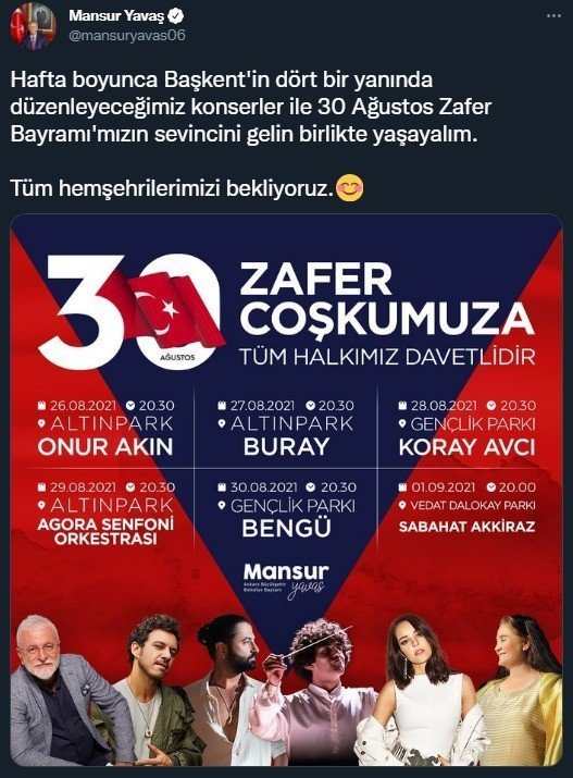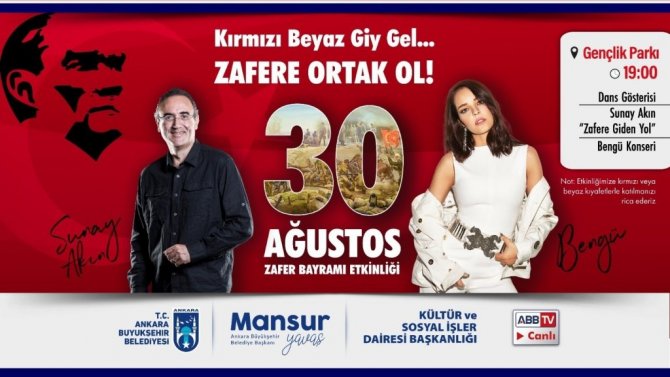 Başkentlilerden 30 Ağustos Zafer Bayramı konserine "Kırmızı Beyaz Giy Gel. Zafere Ortak Ol" çağrısıyla kırmızı beyaz kıyafet giyerek katılmalarını isteyen Ankara Büyükşehir Belediyesi, kutlama programında dans gösterisiyle de Başkentlilere unutulmaz bir zafer bayramı yaşatacak. Sunay Akın ve Bengü'nün sahne alacağı konser ile birlikte hafta boyunca sürecek ücretsiz açık hava konser programlarına tüm vatandaşları sosyal medya hesaplarından yaptığı duyuru ile davet eden Büyükşehir Belediye Başkanı Mansur Yavaş da, "Hafta boyunca Başkent'in dört bir yanında düzenleyeceğimiz konserler ile 30 Ağustos Zafer Bayramımızın sevincini gelin birlikte yaşayalım. Tüm hemşehrilerimizi bekliyoruz" dedi.