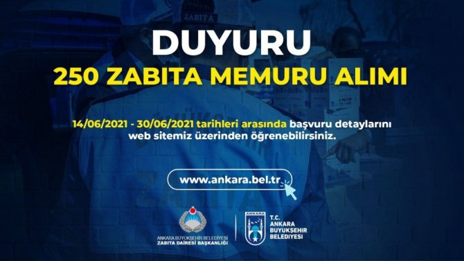 Ankara Büyükşehir Belediyesi, KPSS puanıyla 250 zabıta memuru alımı için ilana çıktı.