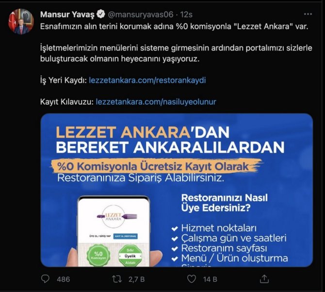 Başkan Yavaş, lokanta, kafe ve restoranların portala üye olmak için nasıl kayıt yaptıracaklarını gösteren iş yeri kaydı ve kayıt kılavuzuna ilişkin linkleri de paylaştı. İşletmelerin hiçbir ücret ödemeden yaptıracakları kayıtların ardından Lezzet Ankara'nın aktifleştirilerek Başkentlilerin kullanımına sunulacağını ifade eden Yavaş, ekonomik yönden destek sağlayacak uygulama sayesinde esnafın komisyon ödemeden sipariş alabileceğini duyurdu.